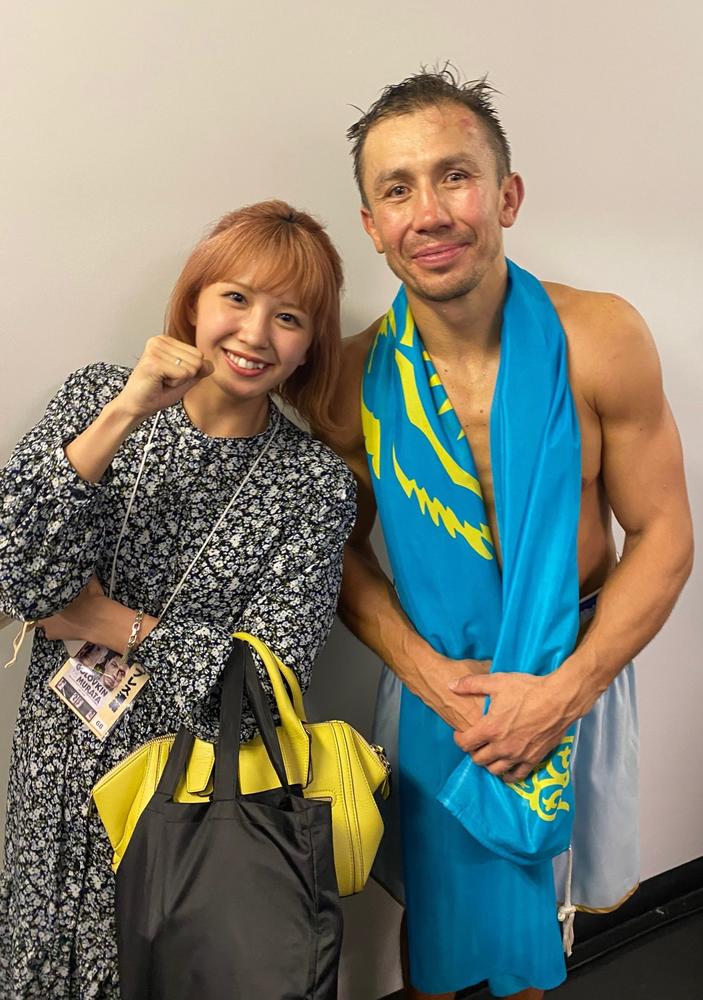 Krush女子アトム級王者・菅原美優(K-1ジム三軒茶屋シルバーウルフ)は、ゴロフキンと「結婚したいくらい好きです」というほどのゴロフキンファン。「チケットが欲しいんですよ~(入手に)頑張ります」と言っていたが、会場で観戦しただけでなく「今日、夢が叶いました!世界で1番、大好きなボクサーに会えました」と、試合後のゴロフキンとのツーショットに成功。自身のSNSにて公開した。