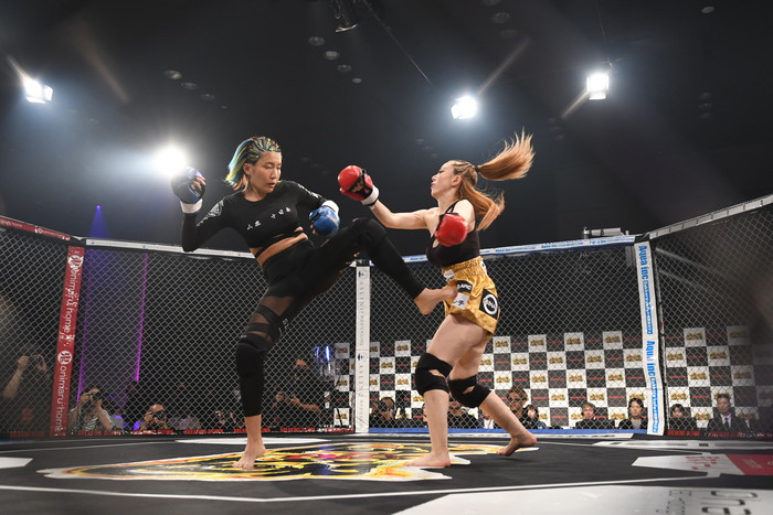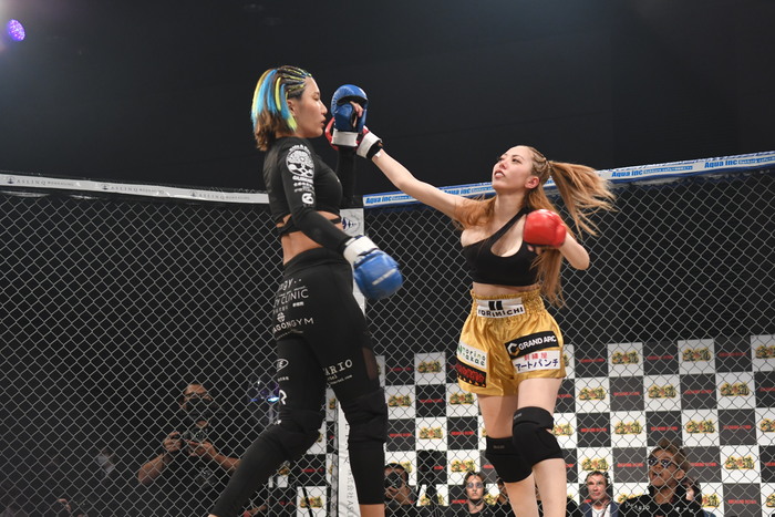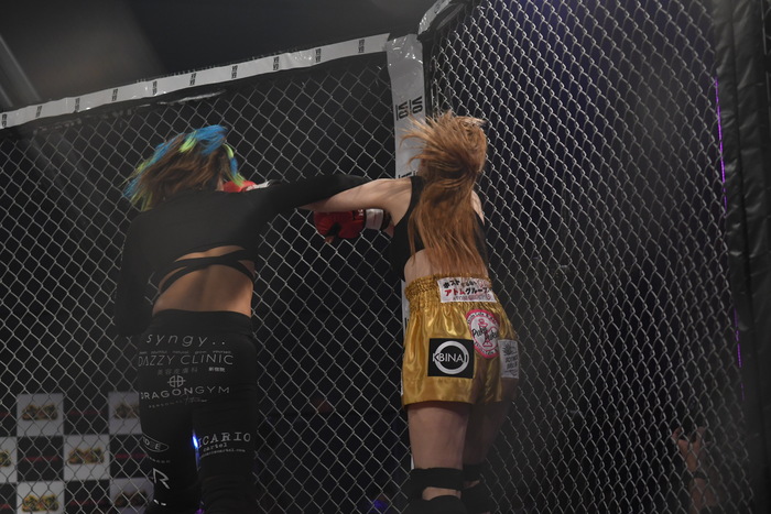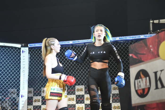 右のパンチをどんどん当てていく緒方は、蹴りも使って右を当てる。みらたむも手を前に出すが緒方の勢いが優る。左右のパンチを振り回す緒方にみらたむは後退し、緒方の判定勝ち。