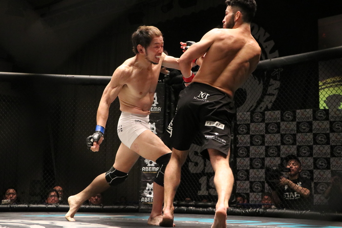 1R、サウスポー構えの宇野にオーソのオーディンは右ミドル。圧力をかけて金網を背負わせるオーディンに宇野は前蹴りも、オーディンは右ボディストレート、右ストレートを伸ばす。宇野はシングルレッグに入ろうとするが足を掴めず、引き込み気味に下になるが、オーディンは付き合わず。ブレークでスタンド再開。