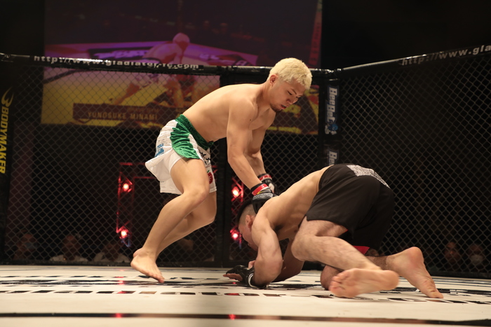初回残り1分でTKO勝ちの南はGLADIATOR3連勝。「BRAVEの南です。前回はプロとして情けないことをして、今回東京に帰ってやってきたことが出せて良かったです。パンチで倒すのが目的やったんですけど、パウンドアウトというのも新しいものを見せられて良かったと思います。そろそろ強い相手を。年内に僕、タイトルマッチを目指しているんで、10月でも7月でもいいんで、やりたい選手がいて、元チャンピオンのテムーレン(アルギルマー)選手。竹本(啓哉)選手と竹中(大地)選手を相手に2連敗中だと思うんで、僕、4連勝中なんでちょうどいいかと。どうですか、皆さん」と語った。