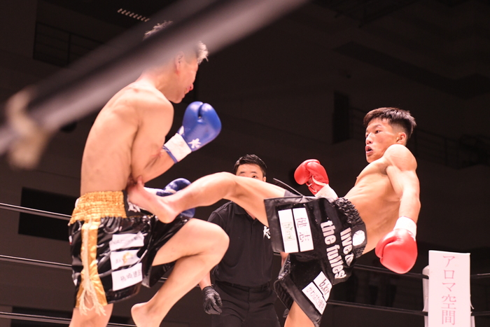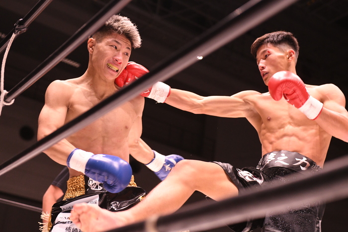 1R、前に出るのは開で左右フック、加藤はクリンチ状態になると伸び上がるようにして開のアゴに肩をぶつける変わった技。互いに右カーフを蹴り、加藤は左三日月とヒザも蹴る。さらに左ボディで追い打ちをかけると開は下がるが、すぐにワンツー連打で反撃。加藤の左ミドルがローブローとなり、試合は中断に。再開後、伸びるジャブと右カーフで攻める加藤は左ボディもめり込ませた。