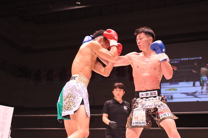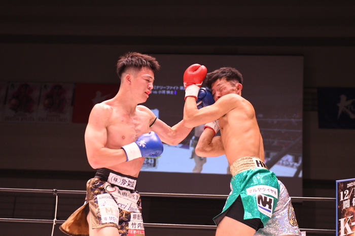 1R、序盤から蹴りを多用する光弥に対してサウスポーの小河は左右の連打で対抗。左右ミドルを交互に蹴る光弥にワンツーを合わせる小河は左ボディも打つ。光弥も負けじとボディ。超接近戦でもみ合うような展開から光弥のヒザがローブローとなってしまい中断。ワンツーから左アッパーをヒットさせる小河はパンチの回転力で上回る。