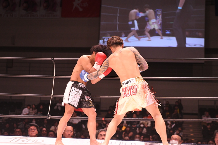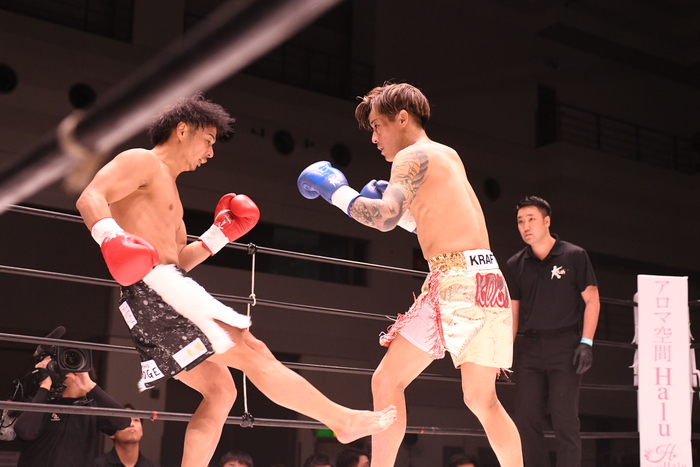 1R、小川は右カーフを蹴り、山田は前へ出て顔面とボディへの左右フック。どんどん前へ出る山田に小川は後退する。小川のインローがローブローとなり中断。再開後は小川が前へ出て右ローと左ミドルを蹴っていくが、そこへ山田が左フックを振り抜いてダウンを奪う。