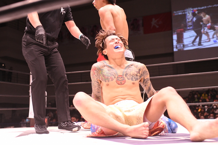 3R、小川が右カーフでダウンを奪う。右足をかばいながら左右ボディとワンツーを打つ山田、右カーフ&左インカーフを蹴る小川。右カーフで山田がダウンし、レフェリーがストップ。小川が逆転KO勝利を奪った。