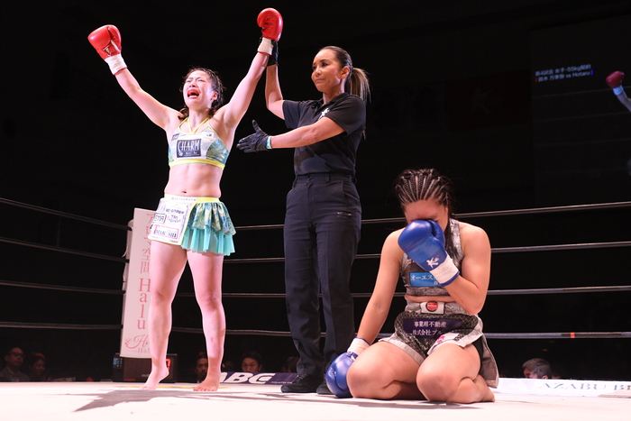 3R、鈴木の右ストレートがヒットし、下がるHotaruだが右ローからのワンツーで反撃。鈴木は左ミドルを蹴るがHotaruは右ローから左ミドル。このラウンドはHotaruがギアを上げて手数を出す。鈴木が右ミドルから左右連打を入れるが、Hotaruの右ストレートで後退。左ミドルの連打で前へ出る鈴木はヒザも蹴る。Hotaruのワンツーを被弾しながらもヒザを蹴る鈴木。ワンツーから左ミドル、さらに連打と攻める鈴木にHotaruも負けじと打ち返して足を止めての打ち合いに。最後は鈴木の右アッパーがヒット。