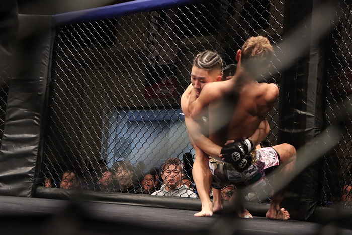 2分のインターバルでボクシンググローブをオープンフィンガーグローブにチェンジしMMAルールに。
