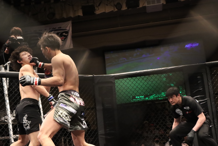 立ち上がる両者。ワンツーの荻窪に、北野は右から左でダウンを奪う! 下の荻窪は腕を手繰り、蹴り上げもゴング。
