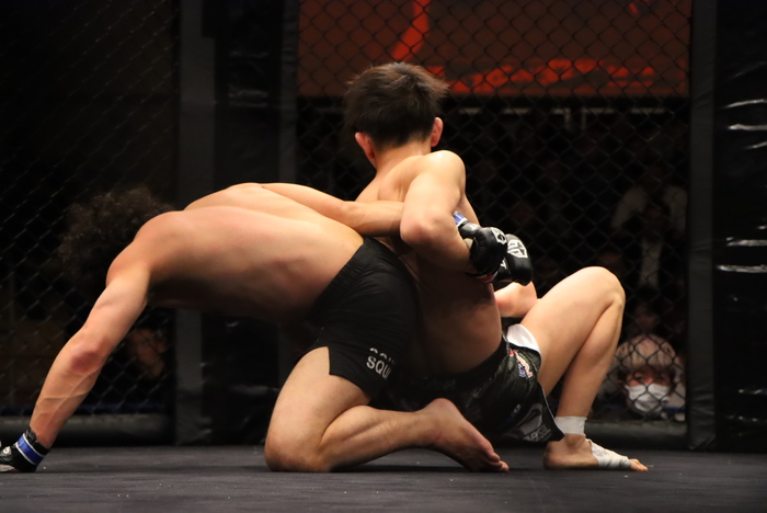 2R、ゴングと同時に詰めてダブルレッグテイクダウンの荻窪。金網背に上体立てたままの北野は片ヒザ立ちまで戻すと、右で差して立ち上がり押し込み。