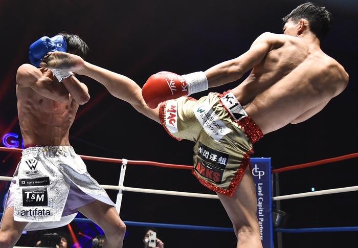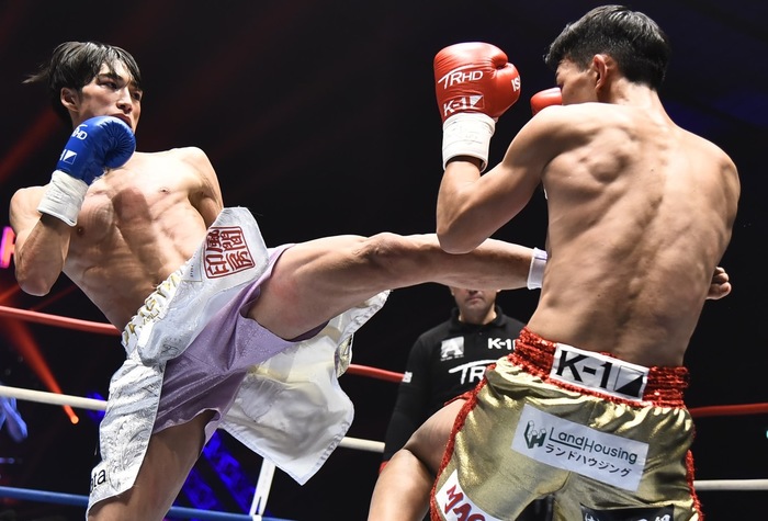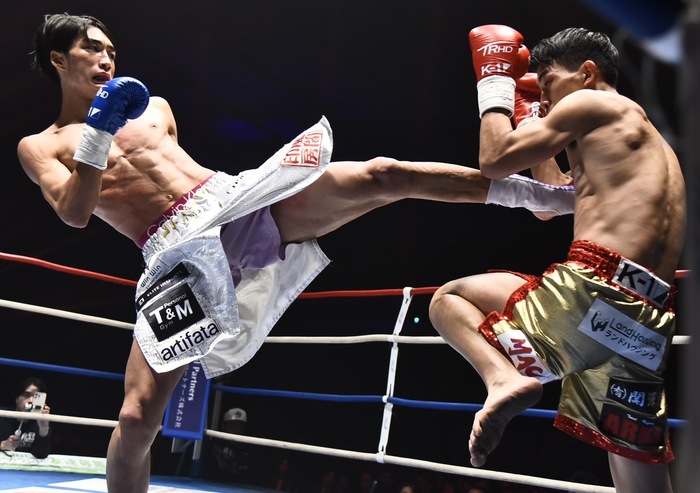2R、左ボディを打ち合う両者。大久保は左ミドルも蹴る。ここまで先手先手と攻めていた大久保だがいったん落ち着き、璃明武はジャブを突く。大久保はワンツーからの左ミドルをしっかり当て、クリンチになると璃明武をコカす。ジャブの突き合いはリーチで優る大久保が有利。璃明武がワンツーを繰り出すと大久保はかわしながら左フック。