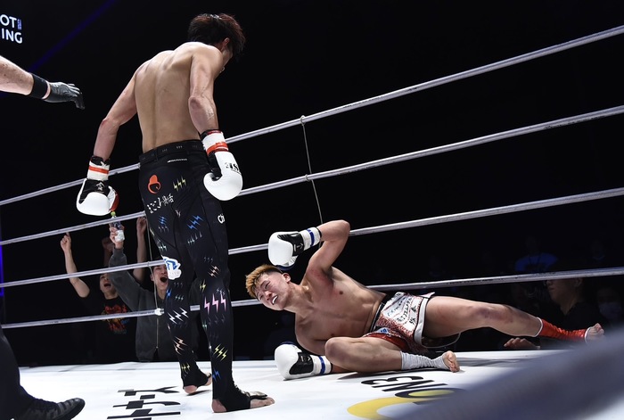3R、左インローを蹴ってパンチ連打で接近するGUMPに笠原は下がりながらの左ミドル。しかし、距離をとれずに笠原はやりにくそう。左ミドル、左ハイ、飛びヒザの笠原。どんどん前へ出るGUMPに押される笠原だが、下がりながらの左ストレートでGUMPをグラつかせて連打でダウンを奪う。