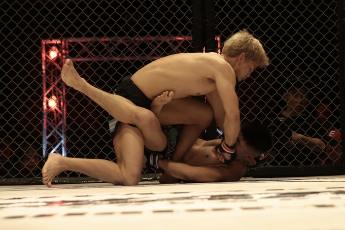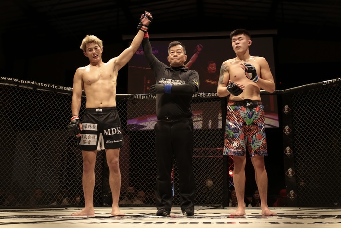 2Rも田口が早々にテイクダウンからハーフでパウンドでドミネート。最後に立った花園のバックに飛び乗り、4の字バックでゴング。判定3-0(20-18×3)で田口が勝利。