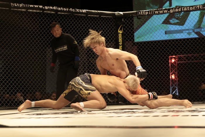 立つコウは回転速い右の強打もしゅんすけに再びテイクダウンされる。右で脇差しパスのしゅんすけは上四方、ニーインで鉄槌でパウンド。