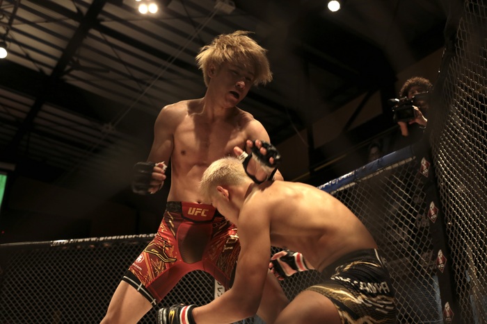 1R、右ストレートで詰めるコウに、しゅんすけは右でダウンを奪うと左で差して押し込み。しかし突き放したコウはワンツーの右で前に。打ち合いながらしゅんすけはダブルレッグテイクダウン。