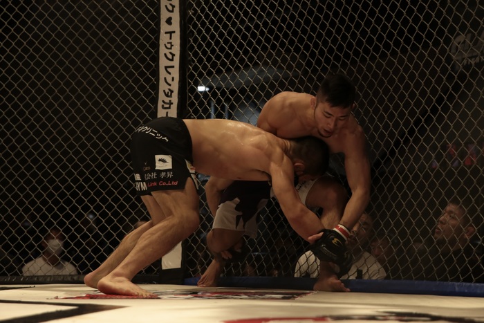 2R、右から左で差して押し込む岩倉。右小手のヅッキーニョスはケージ背に押し戻してスタンドに。左から右を当て詰めてダブルレッグテイクダウンの岩倉。ヅッキーニョスは上体を金網に預けて座る。