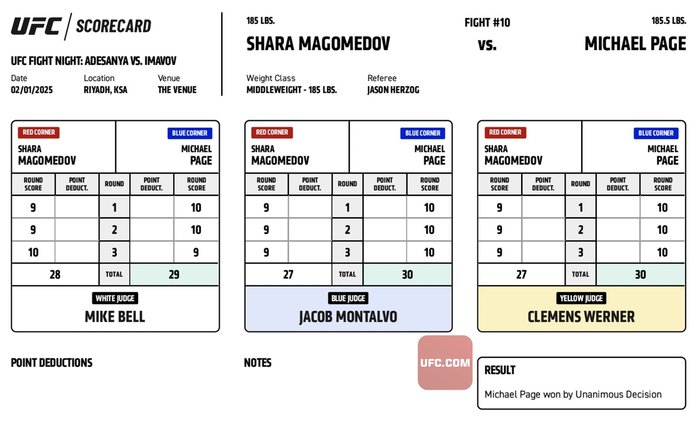 #UFCSaudiArabia Official Result: Michael “Venom” Page (30-27, 30-27, 29-28 | @MichaelPage247) defeats Shara Magomedov by Unanimous Decision.