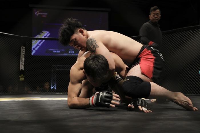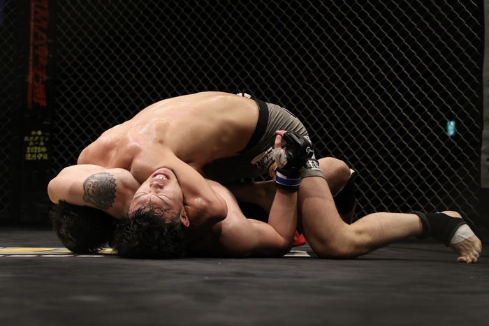 左ハイの宇土。ブロッキングの青木は左右連打も、そこにカウンターのダブルレッグでテイクダウンは宇土。ハーフから左で脇差しパウンド狙いも、フルガードに戻した青木が下から細かい打撃。宇土のインサイドガードから左で足を越えると、そこでスクランブルで青木が立ち上がり、シングルレッグで宇土を崩してホーン。