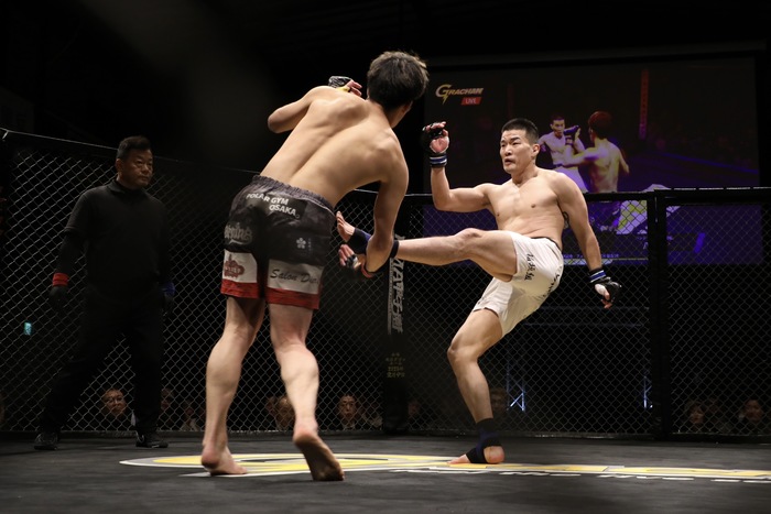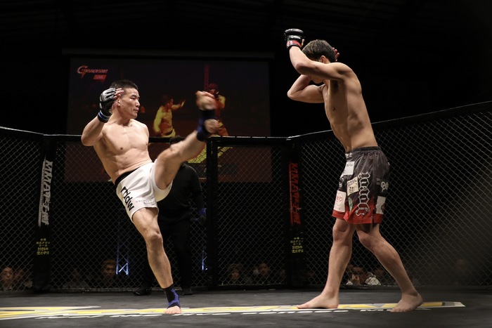 2R、左ローの八木のダブルレッグを切った大搗。右ジャブ、左ロー。八木は再びダブルレッグからケージに押し込むも、大搗のヒザがローブローとなり中断。再開。八木の右前手フックをかわした大搗は右インロー。左カーフを突く八木に、大搗も左カーフ。八木のローの打ち返しに左右で詰めるが、回る八木は距離を取り、左ローをヒット。