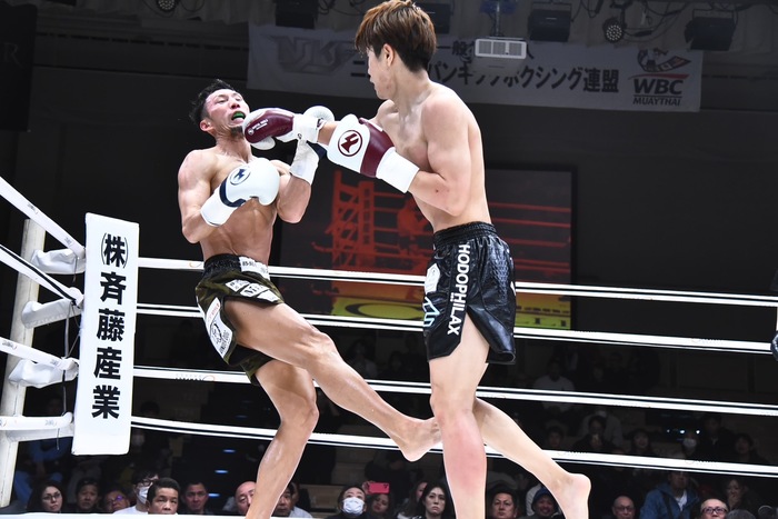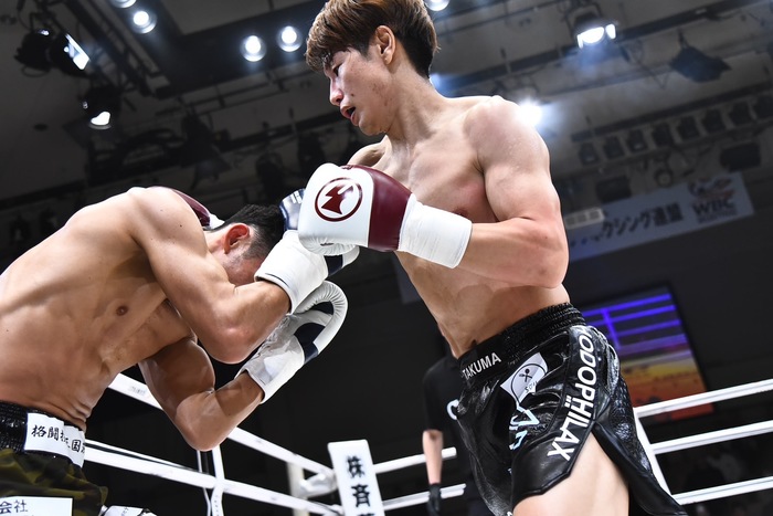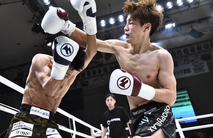 1R、まずはローの蹴り合い。徐々に圧を強めていく大田はTAKAYUKIをコーナーへ詰めると右フックからの左ボディ。大良は右ボディストレートからの左フック、TAKAYUKIは左インローを蹴っていく。