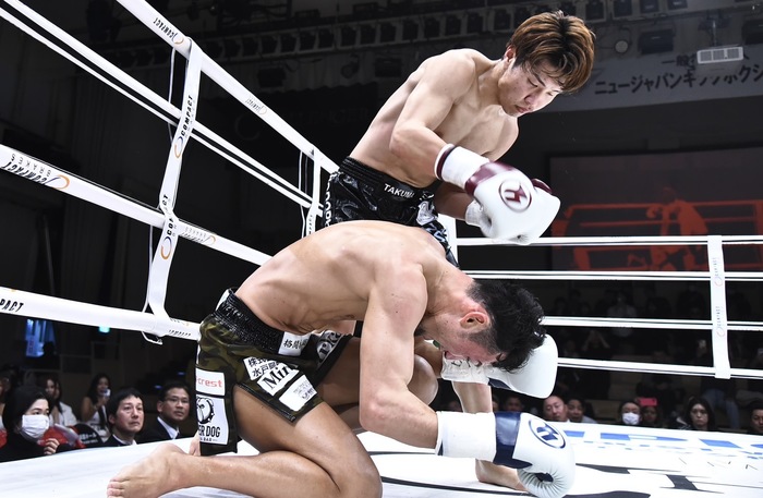2R、右ローから圧をかけていく大田が左ミドル、TAKAYUKIは右カーフとジャブ。大田が組んでのヒザ2発から右ヒジを打ち下ろしてダウンを奪う。前へ出て詰める大田がヒザ、右ストレートからのヒザ、すぐに右ヒジ。TAKAYUKIはワンツーを放つが大田は左ミドルから右カーフを2発。右ボディストレートをのめり込ませ、TAKAYUKIをコーナーへ詰めると左ボディからの右フックでダウンを追加する。