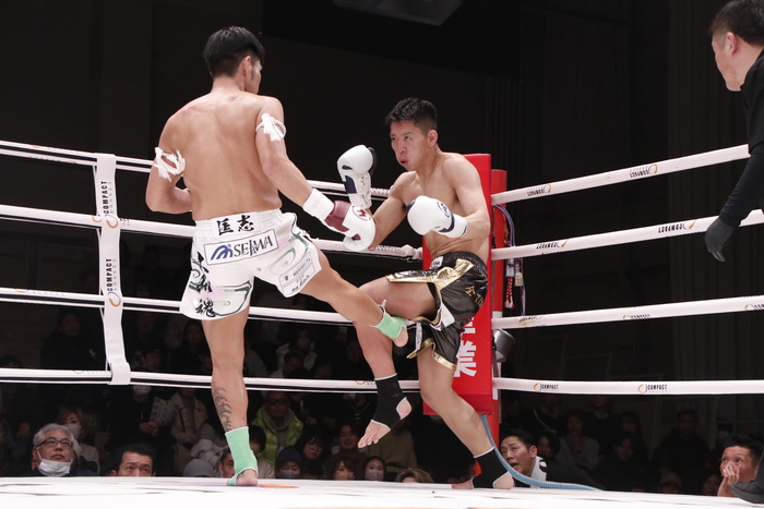 1R、徹底して右カーフを蹴っていく匡志に、雄也は圧をかけられてロープを背負いながらリングを回り込む。匡志はジャブ、左フックを見せながら右カーフ。