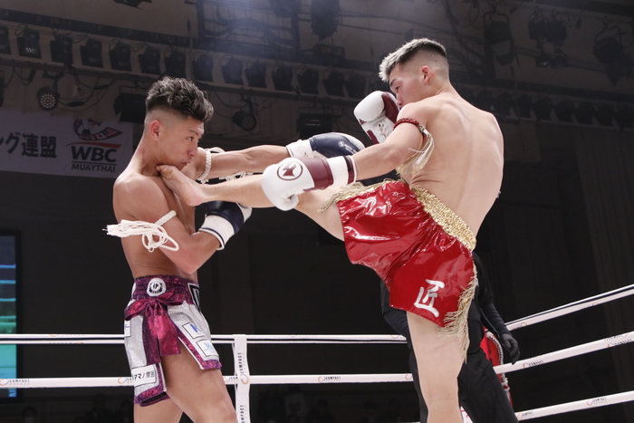 2R、フックで入って来る匠をヒジで迎え撃つ豪は、左の縦ヒジをカウンターでヒットさせてダウンを奪う。さらに右のヒジを振り抜いて匠の左目上をカットして流血させる。