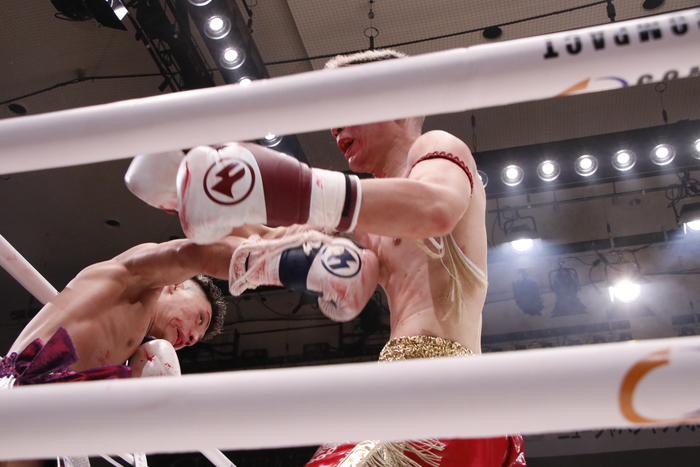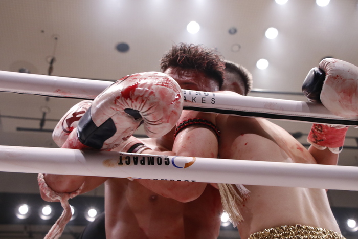 3R、豪のヒジで今度は右目上もカットして顔面だけでなく上半身も血でびっしょりと濡れる匠。それでも諦めず前へ出て打ち合いを挑んでいき、ヒジで逆転を狙うが、ドクターチェックでストップがかかり豪の壮絶なTKO勝ちとなった。