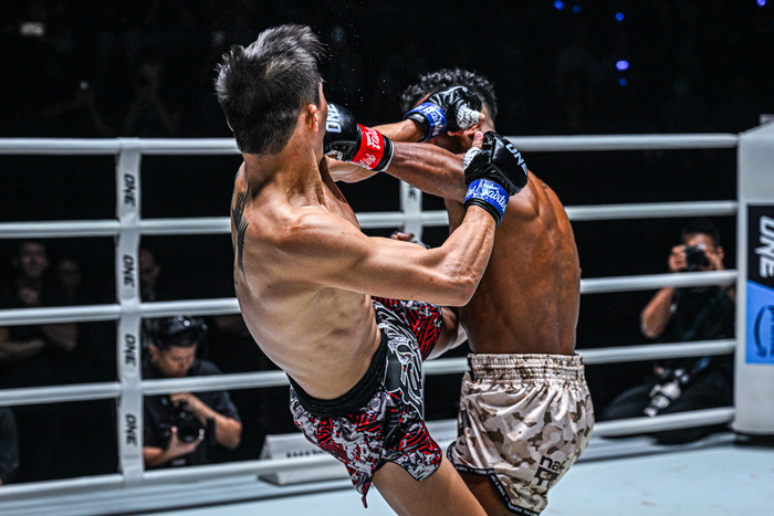 ロボの右ミドルに左ストレートを合わせるセーマペッチ。詰めるロボは左ヒジで飛び込み。セーマペッチも左の攻撃で押し戻す。