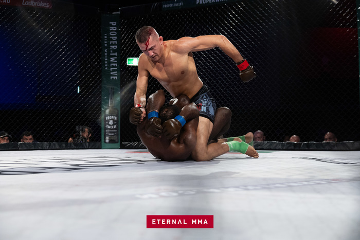 1R、サウスポー構えのスタッダートに、オーソのロウストンは右ミドル。その蹴り終わりにワンツーを突くスタッダート。詰めるロウストンはシングルレッグテイクダウン。