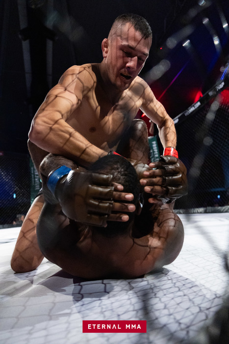 2R、長い右を届かせるロウストンのシングルレッグを切るスタッダート。しかし打ち合いのなかで詰めたロウストンが次はスムーズにテイクダウン。立ち上がりがぶり首を狙うロウストンを跳ね上げて上を取りかけるが、この際を譲らなかったロウストンが上に。