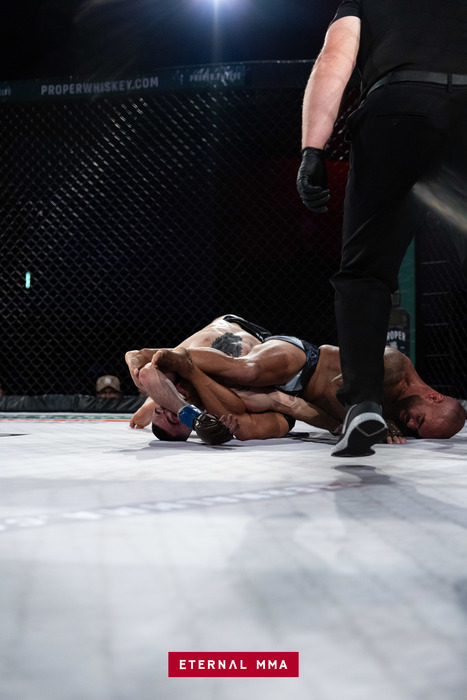 ハーフからパス狙うが、亀になるパーカーにネルソン狙うエッチェルをいなしてバック奪うパーカーが背後からパームトゥパームでリアネイキドチョーク! いったん身体を伸ばされたエッチェルだが、手を剥がして仰向けになり凌ぐ。なおもニアマウントからバック狙いのパーカーに金網まで這って立つエッチェル。