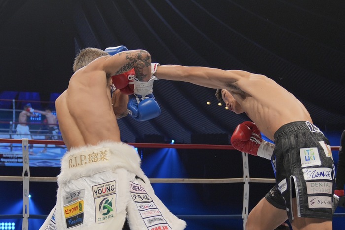 3R、永坂はオーソドックスにスイッチするがすぐにサウスポーへ戻す。左右フックを繰り出す永坂に石田は左ストレート。左右フックを振り回す永坂に石田は直線のワンツー、ジャブをしっかりと当てる石田。当てて離れる石田に永坂は空振りが目立つ。