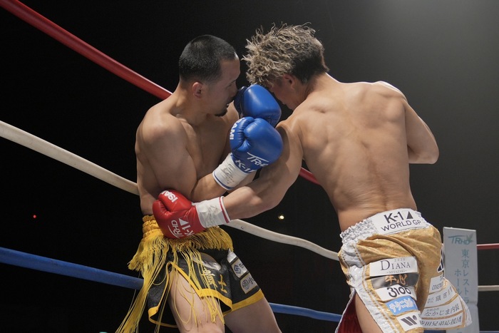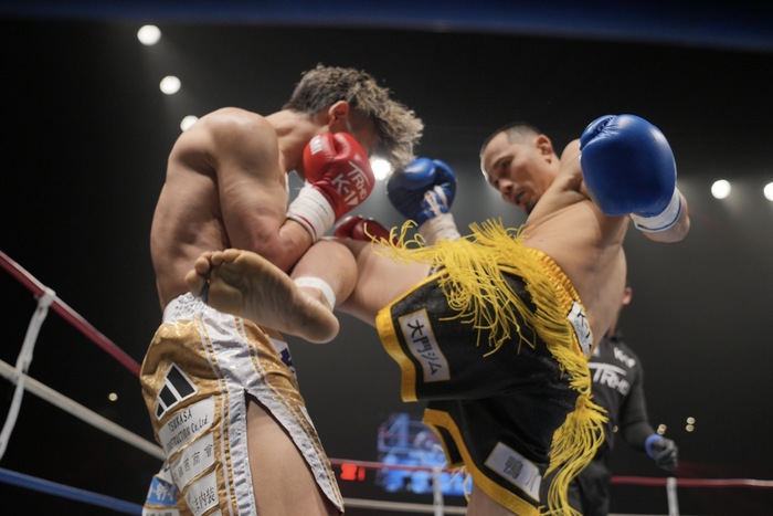 2R、新美が再び前に出て左インロー。しかしローブローになってしまう。新美は左ミドル、左インロー。寺田は前に出て左フック、左ボディを狙う。プッシュして左インローを蹴る新美。右ハイを蹴る寺田は右カーフ、左ボディ。寺田が前蹴り、ヒザ蹴りで新美を迎え撃つ。