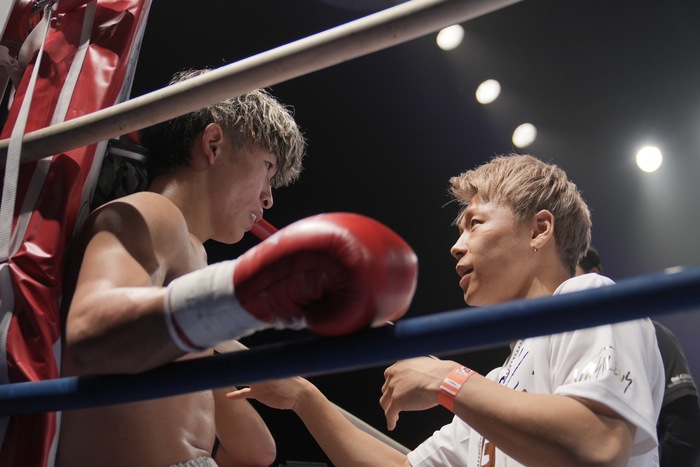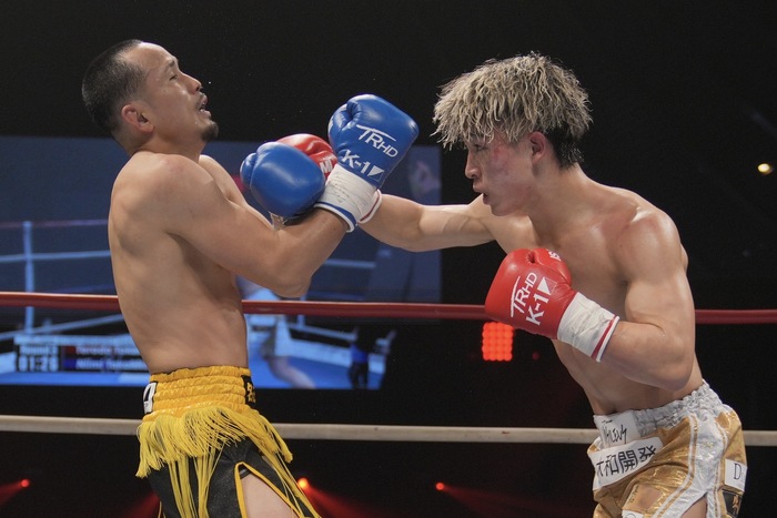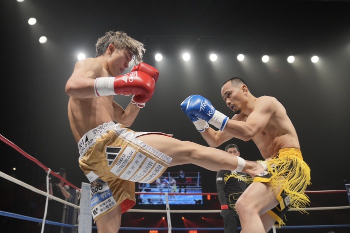 1R、さっそく前に出る新美に前蹴りを出す寺田だが、すぐに新美が距離を詰めてパンチ&ロー、左ミドル。寺田がローを返すとワンツーを繰り出す。サウスポーの新美がノーモーションの左ストレートを打ち、寺田も左フックを打ち返す。寺田が左ボディから左フック、さらに左ボディで新美をロープに釘付け。寺田の左ボディ、左フックに防戦一方となる新美。