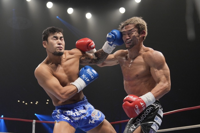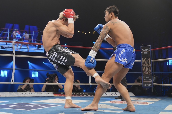 1R、チュンイルは大きな左右フックを打ちながら飛び込む。右カーフも蹴るが松倉も右カーフを蹴り返す。ジャブを突くチュンイルに松倉は強烈な左ミドル。松倉の右カーフに大きくグラつくチュンイル。それでも前へ出て左ボディからの左フック、右フック。
