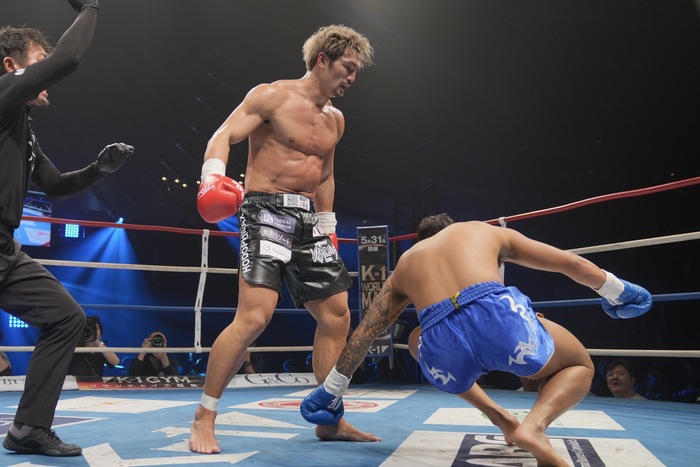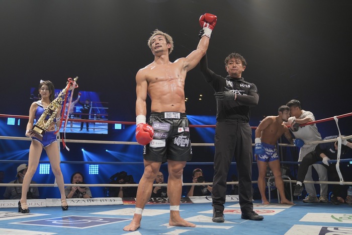 2R、左ミドルを蹴って前へ出ていく松倉が左フック。続けて右カーフ。左右フックを振り回して来るチュンイルに松倉が右カーフを蹴るとチュンイルはダウン。座り込むように体勢となったチュンイルは立ち上がるが、立ち上がるのがやっとで松倉のKO勝ちとなった。