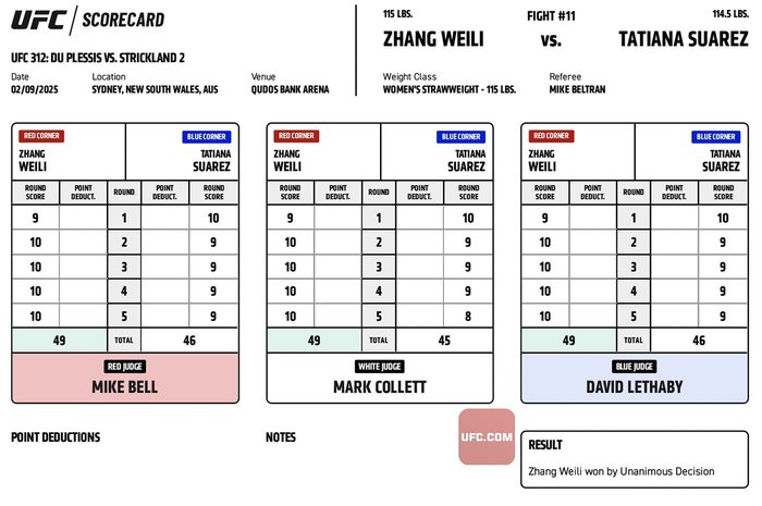 #UFC312 Official Result: Zhang Weili (49-46, 49-46, 49-45 | @MmaWeili) defeats Tatiana Suarez by Unanimous Decision.