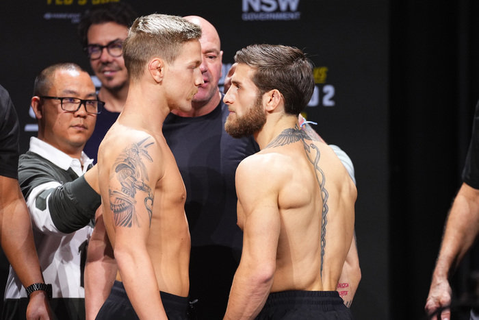 トプリアはレスリングベースで柔術も黒帯。2021年にMMA復帰し、3連続1R KO勝ち。29歳。コーディ・ハドンの代わりに10日前代打出場のシックネスは豪州HEX Fightバンタム級王者からUFC地元大会でデビュー。現在3試合連続1Rフィニッシュ中。
