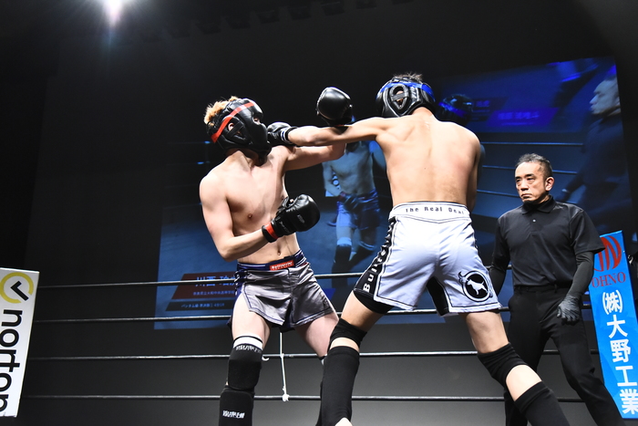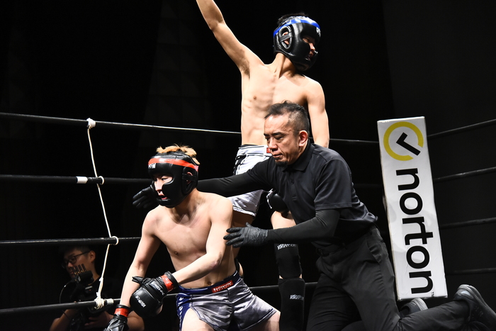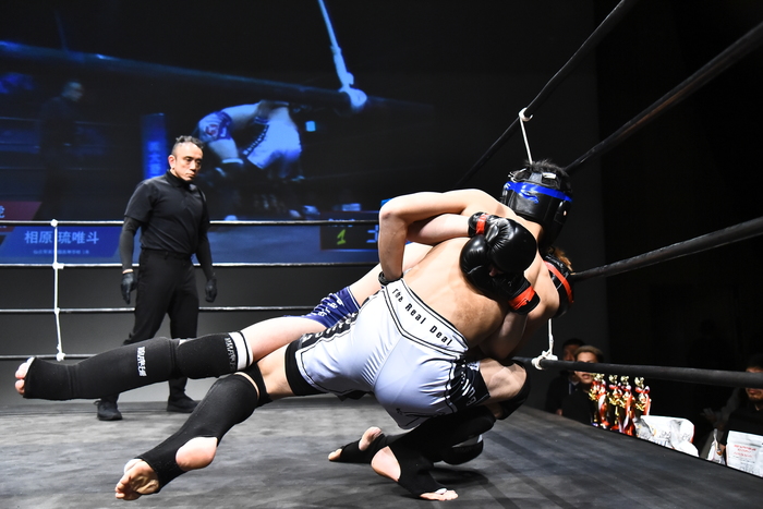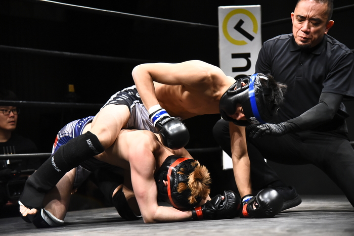 左腕を抜いた川西に、下から草刈で立つ相原は右を突きヒザ。さらに首投げテイクダウン、マウント&パウンドにレフェリーが間に入った。