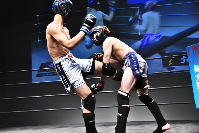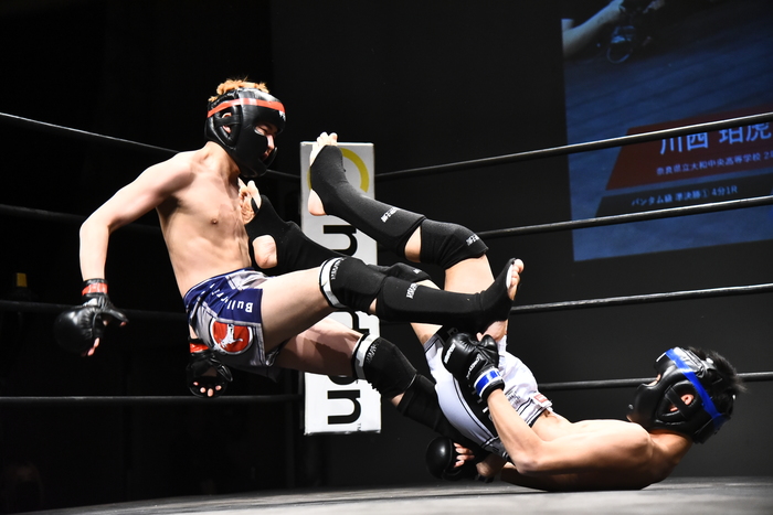 左右で詰める空手ベースの川西だが、左差しの相原は回す。残す川西。しかし相原はボディロックテイクダウン。マウント。川西は下からヒップスローでスイープも、下の川西は右でコムロック!