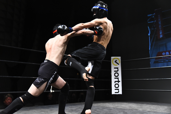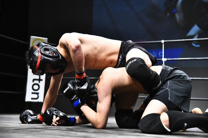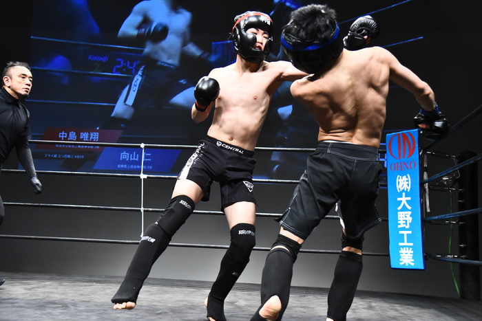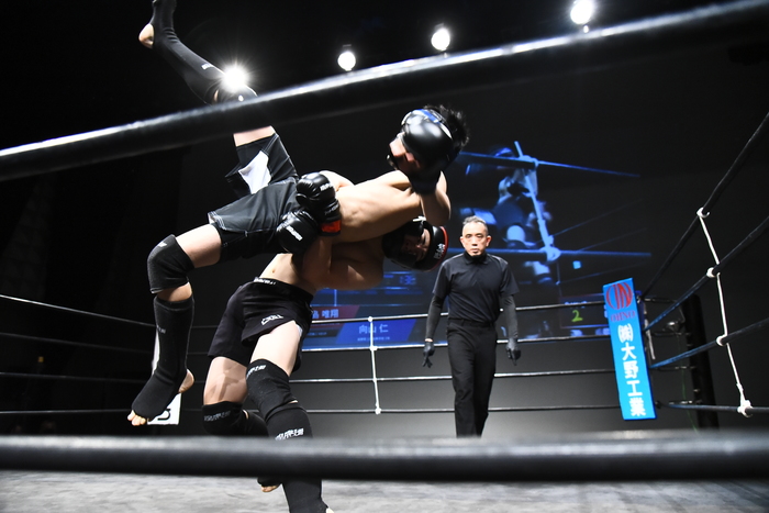 2R、向山の蹴り終わりに詰める中島は左右から組むが突き放した向山は左を当てる。中島はボディロックテイクダウン。しかし立つ向山はコーナーから剥がして投げる中島がスラム。