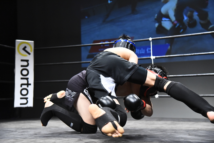 1R、サウスポー構えの向山の左の蹴り終わりにオーソの中島。はダブルレッグ。しかし残した向山はコーナーまで動いて残す。四つから中島のシングルを切ってバックを奪う向山。