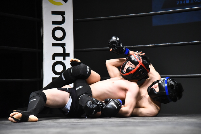 4の字ロックからリアネイキドチョーク狙い。大き目のアンコとヘッドギアがあるなかで極めにくいなか、亀になっても仰向けにさせてコントロールする向山。しかし、正対する中島に下から腕十字狙いの向山を切る中島。
