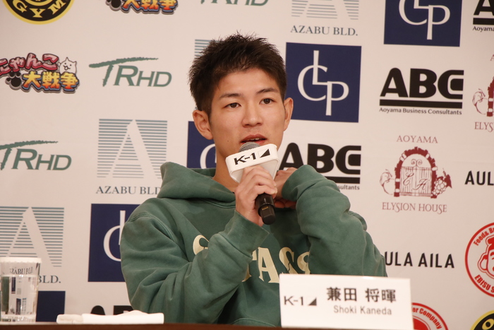 第6試合のK-1フェザー級3分3R延長1Rで、玖村修平(K-1ジム五反田チームキングス)を1R2分57秒、左フックでKOした兼田将暉(RKS顕修塾)が出席。前夜の試合を振り返った。