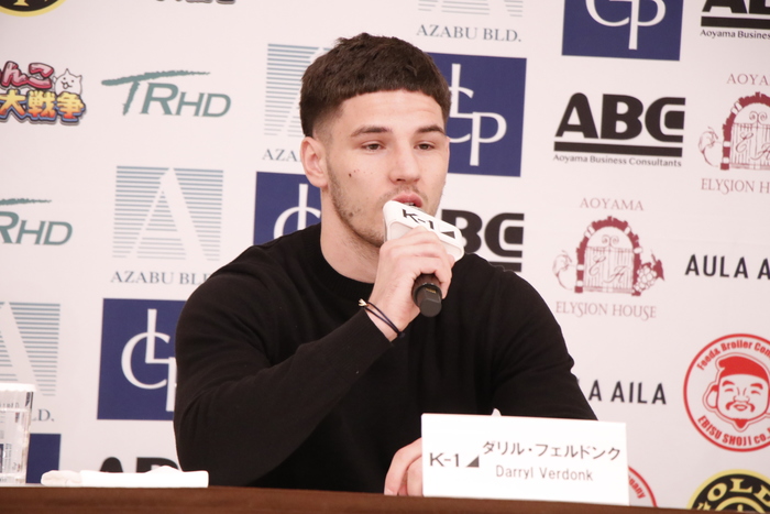 第15試合のK-1スーパー・ウェルター級3分3R延長1Rでジョムトーン・ストライカージム(タイ/ストライカージム)を1R1分04秒、バックハンドブローでKOしたダリル・フェルドンク(オランダ/Fight Team Ringer)が出席。前夜の試合を振り返った。