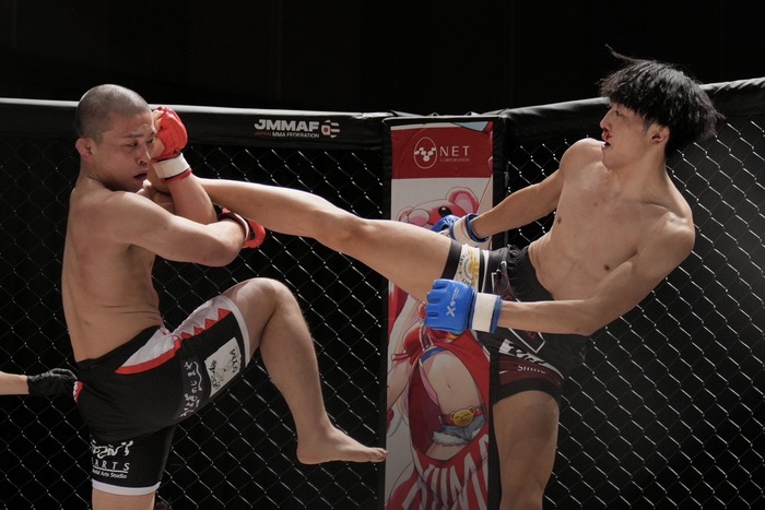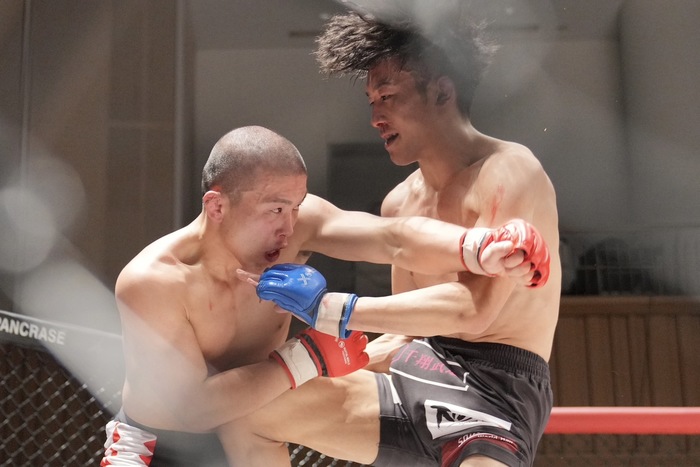 被弾したタカリンダマンに右ストレートも突くが、右で差して組むタカリンダマンはケージに押し込み、大腰気味に投げ。残す木村にダブルレッグも差し上げる木村は右ヒジ! さらにヒザで突き放す。木村の右の打ち終わりに詰めるタカリンダマンだが、体を入れ替える木村は右ヒジ。そこに一本背負いのタカリンダマンだが、ここは押さえ込まれずすぐに立つ木村。