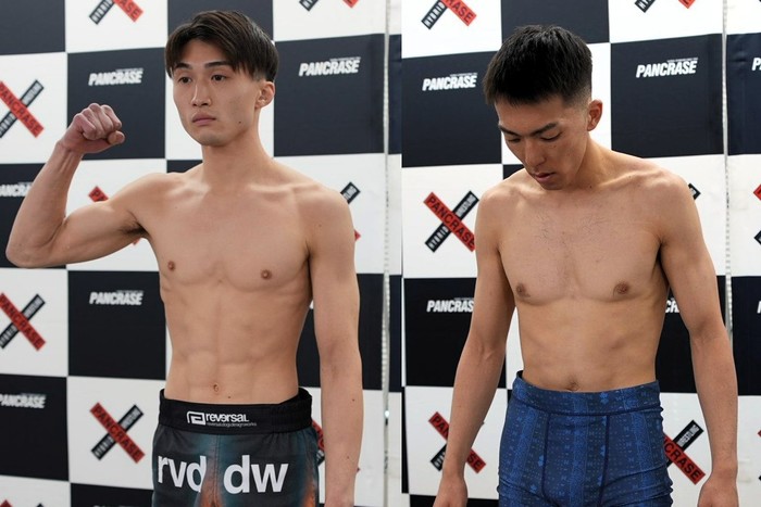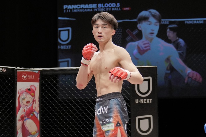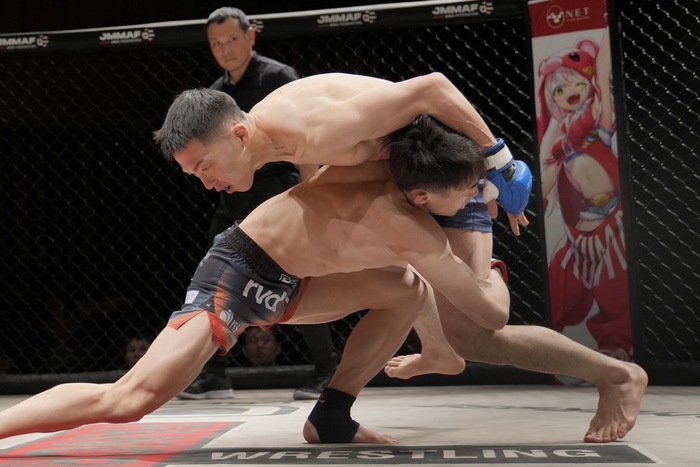 1R、右を振ってダブルレッグテイクダウンの本川。送り手を剥がしてすぐに立つ降旗は右差しで押し込み。離れる本川。左を突いて素早いダブルレッグテイクダウン! すぐにバックを奪い4の字ロック。左手で片手チョークも狙うと降旗はヒジを押し上げて外す。マウントに移行する本川にスクランブルに立つ降旗。