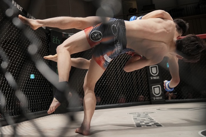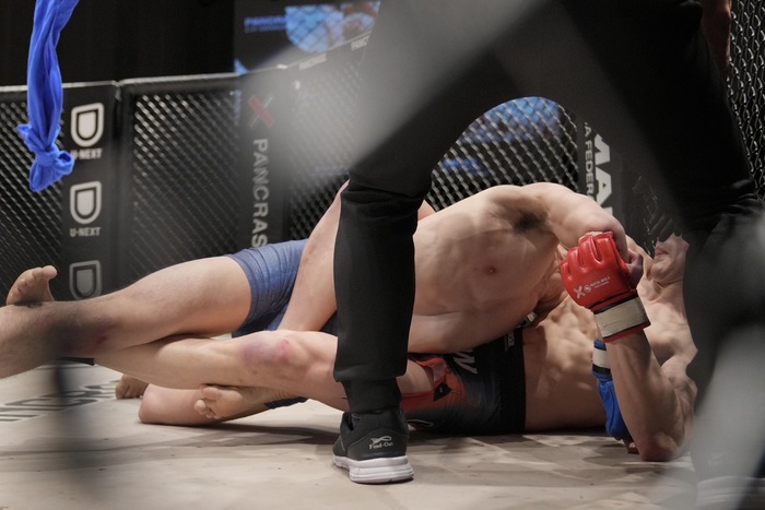 2R、降旗の右ヒザの打ち終わりに組んだ本川は首投げテイクダウン。脇差し上げ上を取る降旗にスクランブルから巧みにバックを奪う本川は4の字ロック。脇を潜って落とそうとする降旗の正対際ににおたつロックでツイスターを極めた。