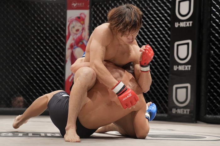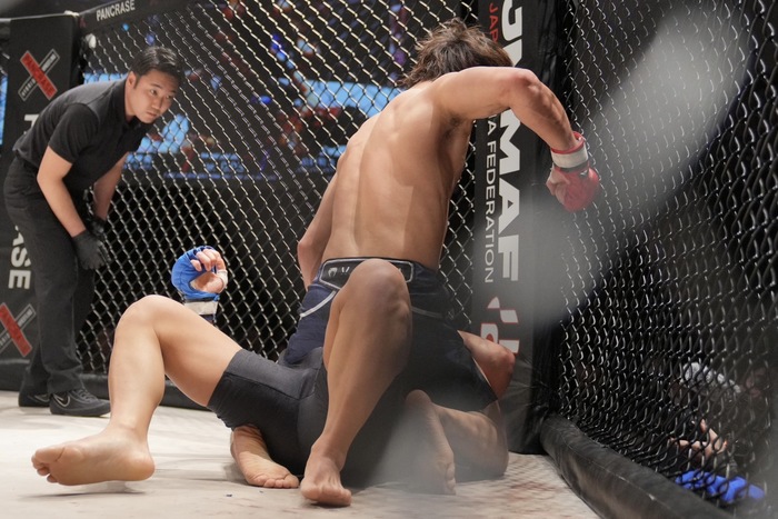 ついに背中を着いた加藤に左枕でハーフからマウント。残り10秒で上体を立ててヒジ、パウンドラッシュでホーン。