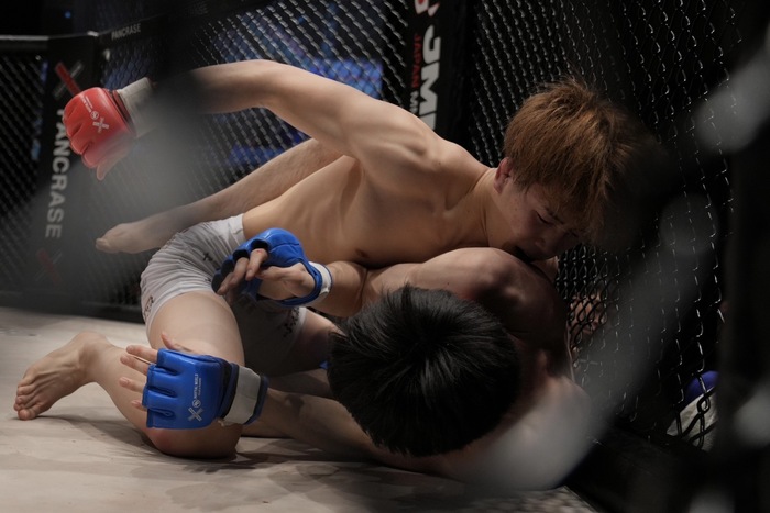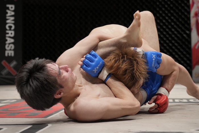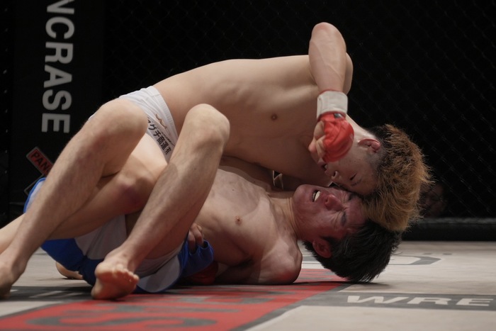 しかし後ろ手で藤野の手を掴んだ柴山は左のパウンド! 藤野の宇十字もかわしてトップから片足をまたぐ。ジャッジ3者が10-9で柴山を支持。