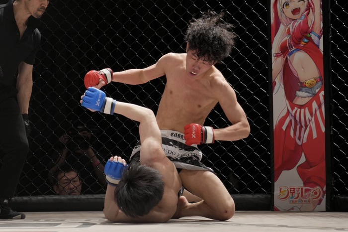 2R、勢いよく前に出る高橋。それをさばきダブルレッグでケージまでドライブする渋井。左差しで押し込む渋井に右は組ませない高橋は崩して上に。しかし、スクランブルする渋井が上に。手首を掴む高橋は腕十字狙いも肩を入れて外してパウンドの渋井。高橋も足を効かせるが左枕でパス、右ヒザをニーインでサイドからパウンド、マウントを奪う渋井がパウンド! 背中を見せる高橋に4の字バックに。背後からパウンドでホーン。3者が10-9で渋井を支持。